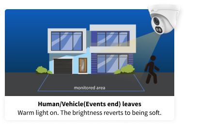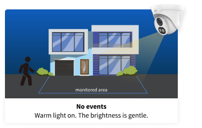 During the night, when no event, the IP camera's warm light provides a minimal level of illumination. When events detected, the illumination is instantly enhanced, thus improving visibility and offering clear details. As soon as the object departs from the monitored zone, the light elegantly dims back to its prior soft level.