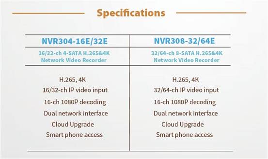 Over the past one year, our NVR products have become more popular in global markets, and has proved its innovation and high quality. In 2015, we continue to put forward innovative new generation NVR products satisfying the need of overseas customers. The model of NVR304-16E/32E and NVR308-32E/64E, featured by H.265 and 4K both, can easily upgrade your video surveillance system to higher definition but save investments for users.
