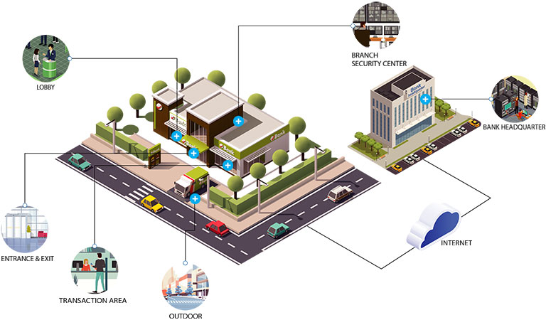 Die Bank ist ein Finanzinstitut, das Einlagen entgegennehmen und Kredite vergeben darf. In einer Bank gibt es verschiedene wichtige Einrichtungen, wie Geldautomaten und Kassen, und jeden Tag besucht eine große Anzahl von Kunden die Geschäftsräume. Eine vollständige Videoüberwachungslösung für Banken muss dies berücksichtigen. Sie muss alle kritischen Bereiche ohne toten Winkel erfassen und ein einheitliches Management vom Hauptsitz aus ermöglichen.