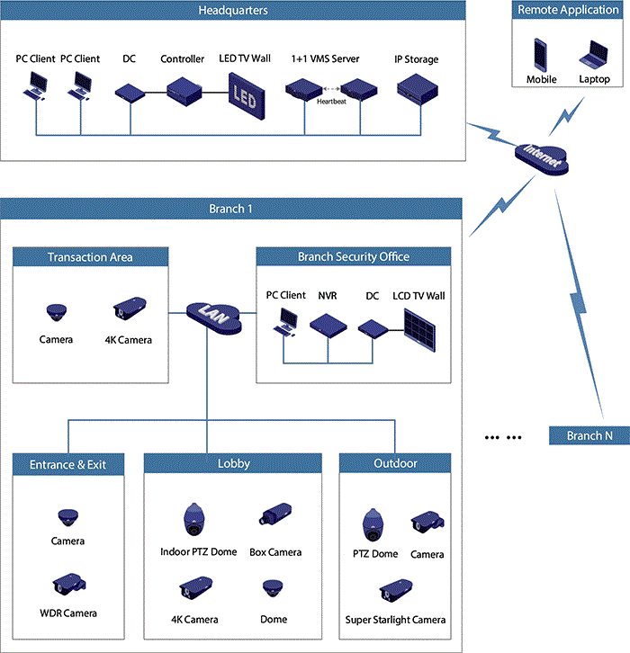 Eine Bank kann zahlreiche Geschäftsstellen haben. Dies verlangt, dass die Geschäftsstellen vom Hauptsitz aus über ein eigenes Netzwerk überwacht werden. Die UNV-Überwachungslösung für Banken kann Vernetzungsprobleme lösen, auch wenn in einigen Geschäftsstellen kein spezielles Netzwerk verfügbar ist. Uniview ist seit 2005 in der Videoüberwachungsbranche tätig und verfügt über eine ausgereifte Überwachungslösung für Banken, die alle potenziellen Sicherheitsherausforderungen löst und in bankbezogenen Anwendungsszenarien aller Art einsetzbar ist.