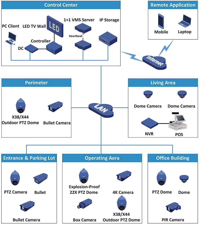 Überwachungslösungen für Industrieparks lassen sich nach verschiedenen Industriebereichen gliedern, wie Energieerzeugung, Stahlproduktion, Maschinenbau, chemische Industrie usw. Uniview ist seit Jahren im Bereich Videoüberwachung tätig und verfügt über umfangreiche Erfahrung und Expertise mit unterschiedlichen Industrieparkprojekten. Uniview bietet nun eine umfassende Lösung zur Überwachung von Industrieparks an, die für entsprechende Überwachungsprojekte aller Art einsetzbar ist.