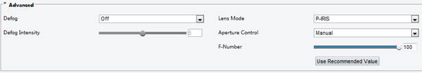 | Aperture Control | Automatically or manually adjust iris. Note: You can set this parameter only when Lens Mode is set to P-Iris. |