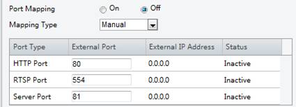 2. Enable Port Mapping and select mapping type. If Manual is selected, then external ports must be configured (external IP is obtained automatically by the camera). If the configured port is occupied, then the Status will show Inactive.