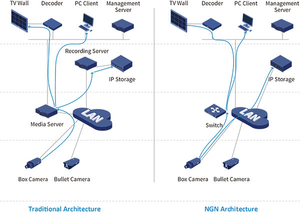 Dans l’architecture traditionnelle, l’enregistrement vidéo est perdu dès que le serveur d’enregistrement cesse de fonctionner. Ce problème est évité dans l’architecture NGN d’UNV où la caméra réseau envoie directement le flux au SAN IP en s’appuyant sur le protocole de stockage standard iSCSI. Cela réduit significativement l’investissement car l’architecture NGN ne comporte ni serveur de médias, ni serveur d’enregistrement.