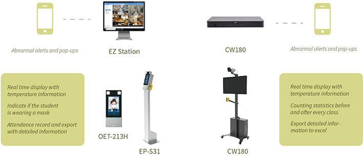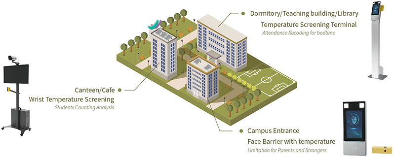 Campuses are facing great challenges for they not only need to measure students’ body temperature but also need to manage both the attendance and temperature records. Moreover, the temperature screening devices need to be flexible in installation to suit for different scenes and students’ height.