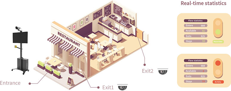 • Monitor the number of people in the restaurant. When the set threshold is reached, an alarm will be triggered